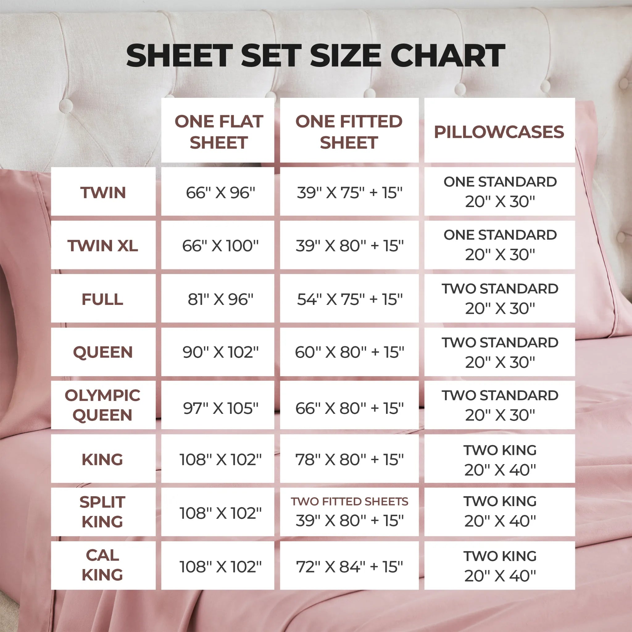 - King Fitted Sheet is 78" x 80", Flat Sheet is 108" x 102", and Pillowcase is 20" x 40".