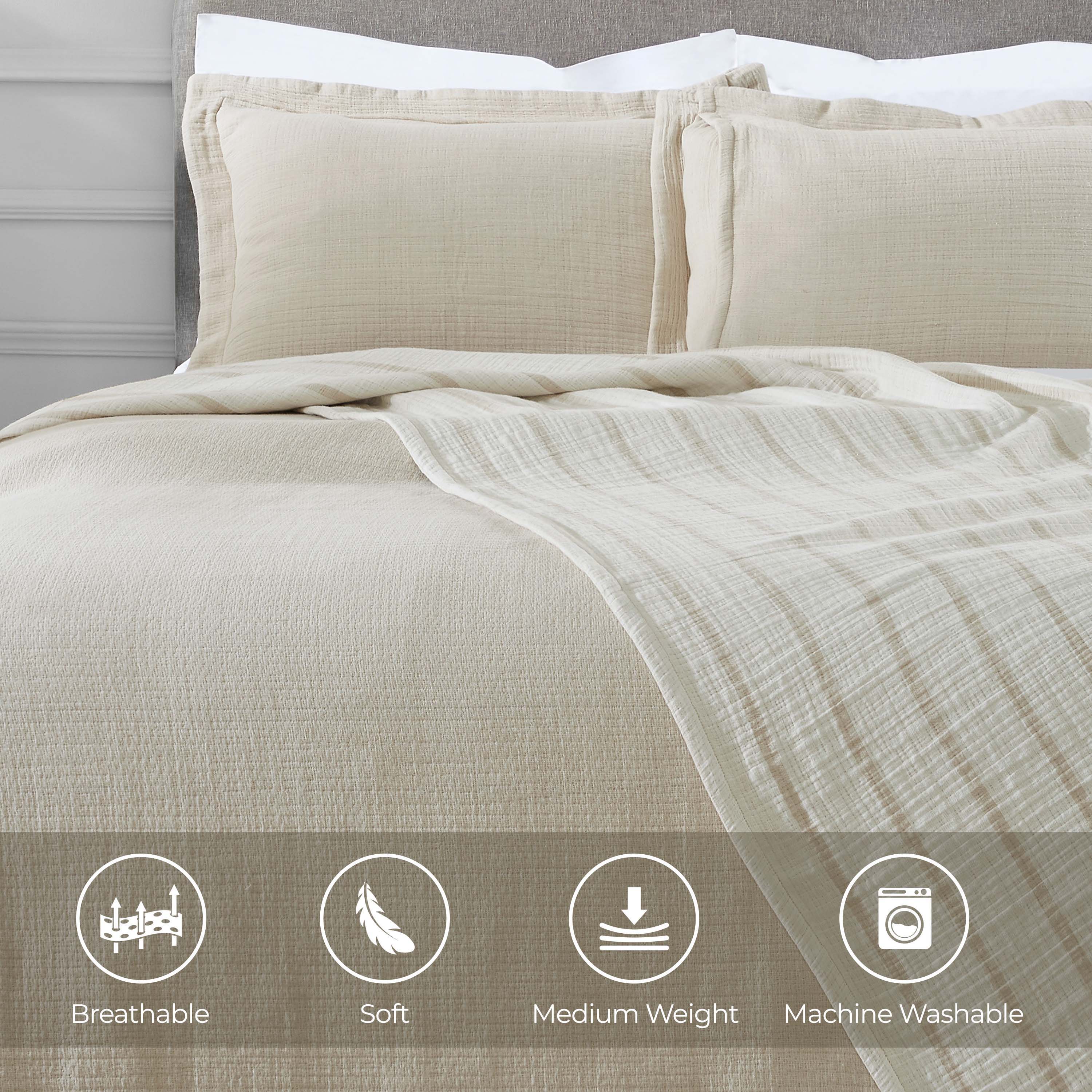- Additional Features: Raised matelasse woven design adds a rich layer to your bed for a refined look. Medium weight material provides maximum warmth and comfort. Matching pillow shams feature envelope closure for easy access and a neat finish.