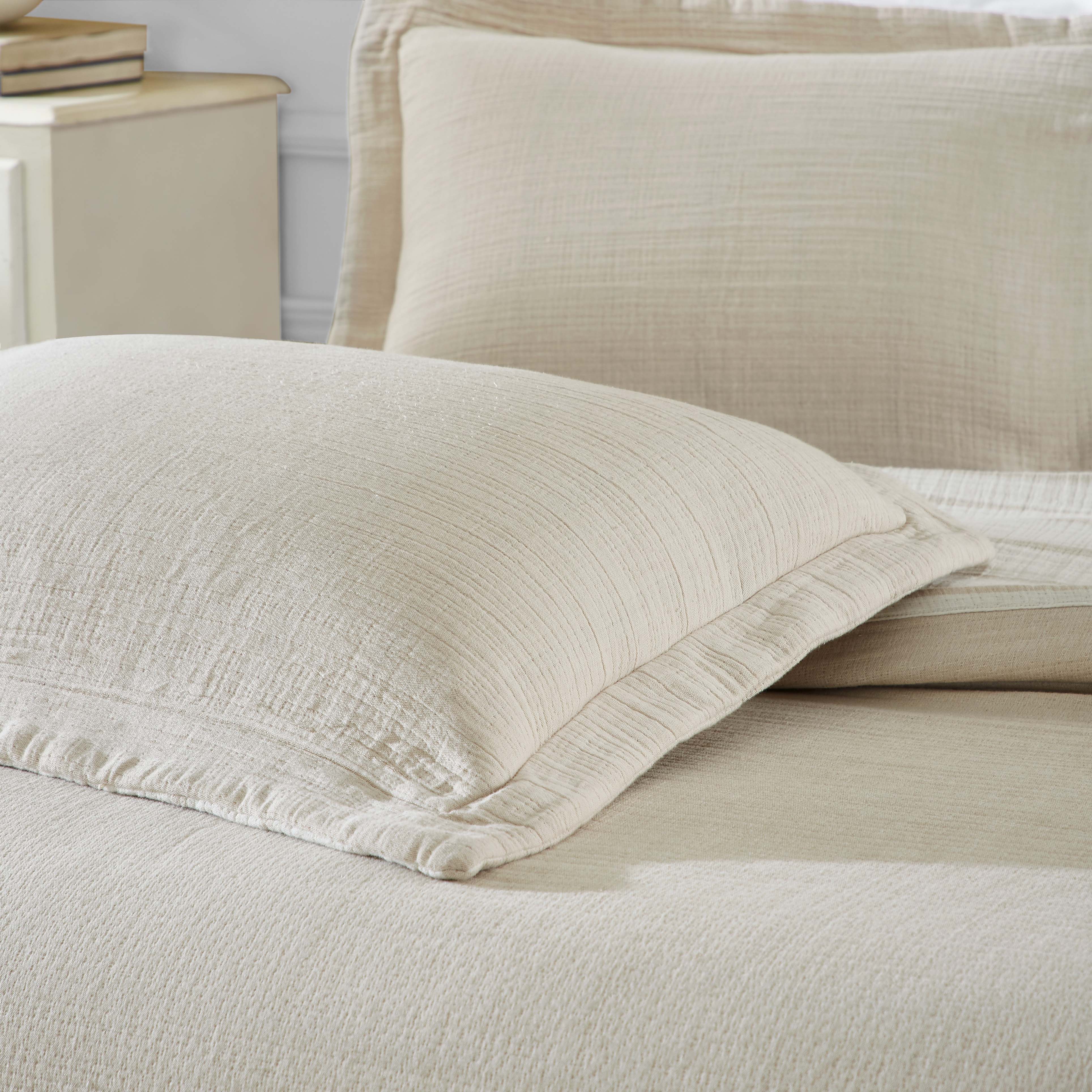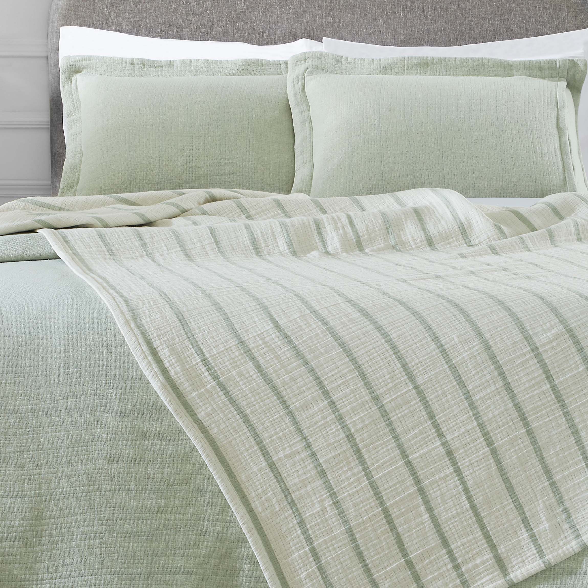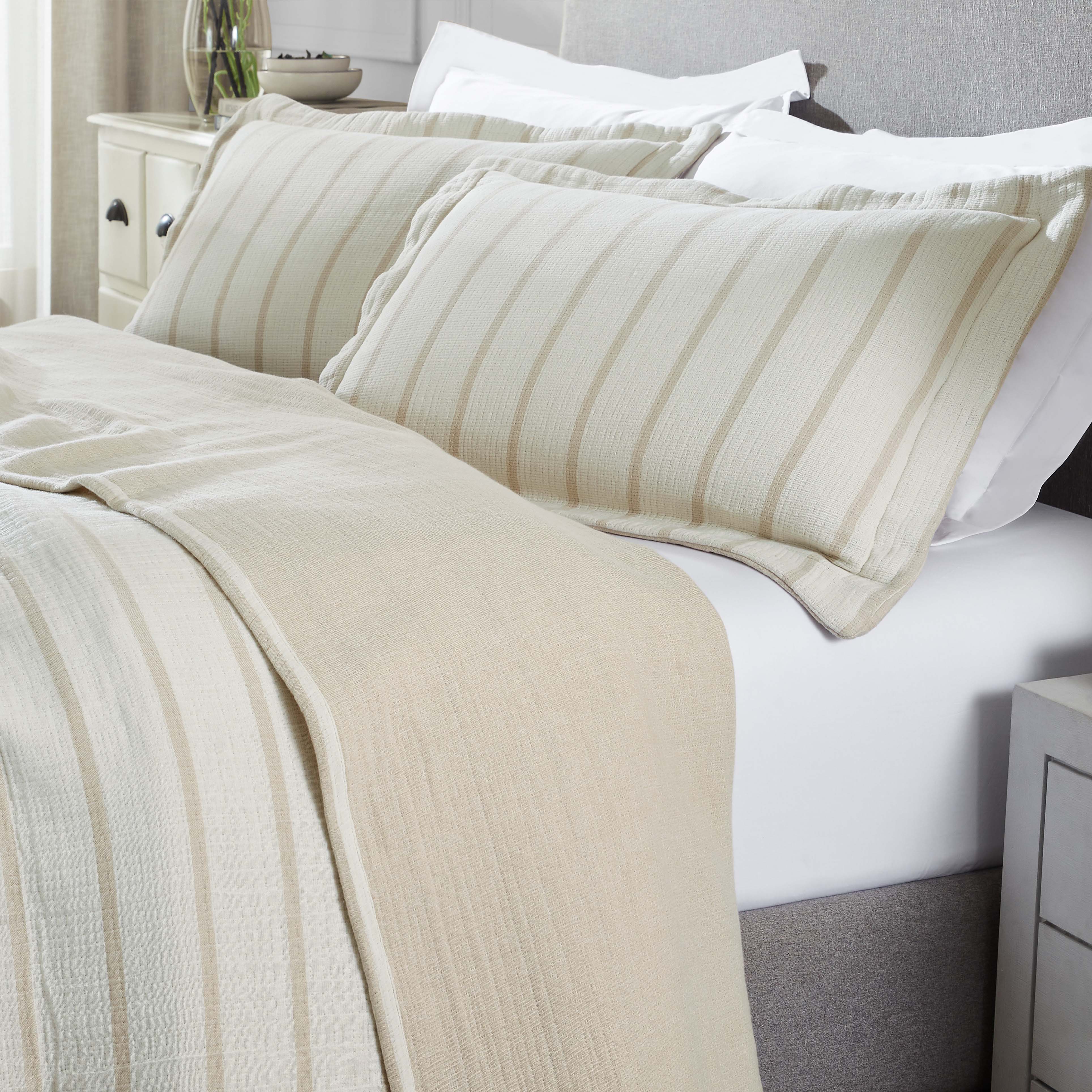 Indulge in the comfort and understated luxury of our Valencia Reversible Matelasse Bedspread and Sham Set. Crafted from a medium-weight fabric perfect for year-round use, this set adds warmth and dimension to your bed. Its crinkled texture invites you to relax, while the reversible design – a timeless stripe on one side, a soothing solid on the other – ensures your bedroom always feels fresh. Available in a palette of inviting colors, complete with coordinating shams, it's the finishing touch your haven deserves.