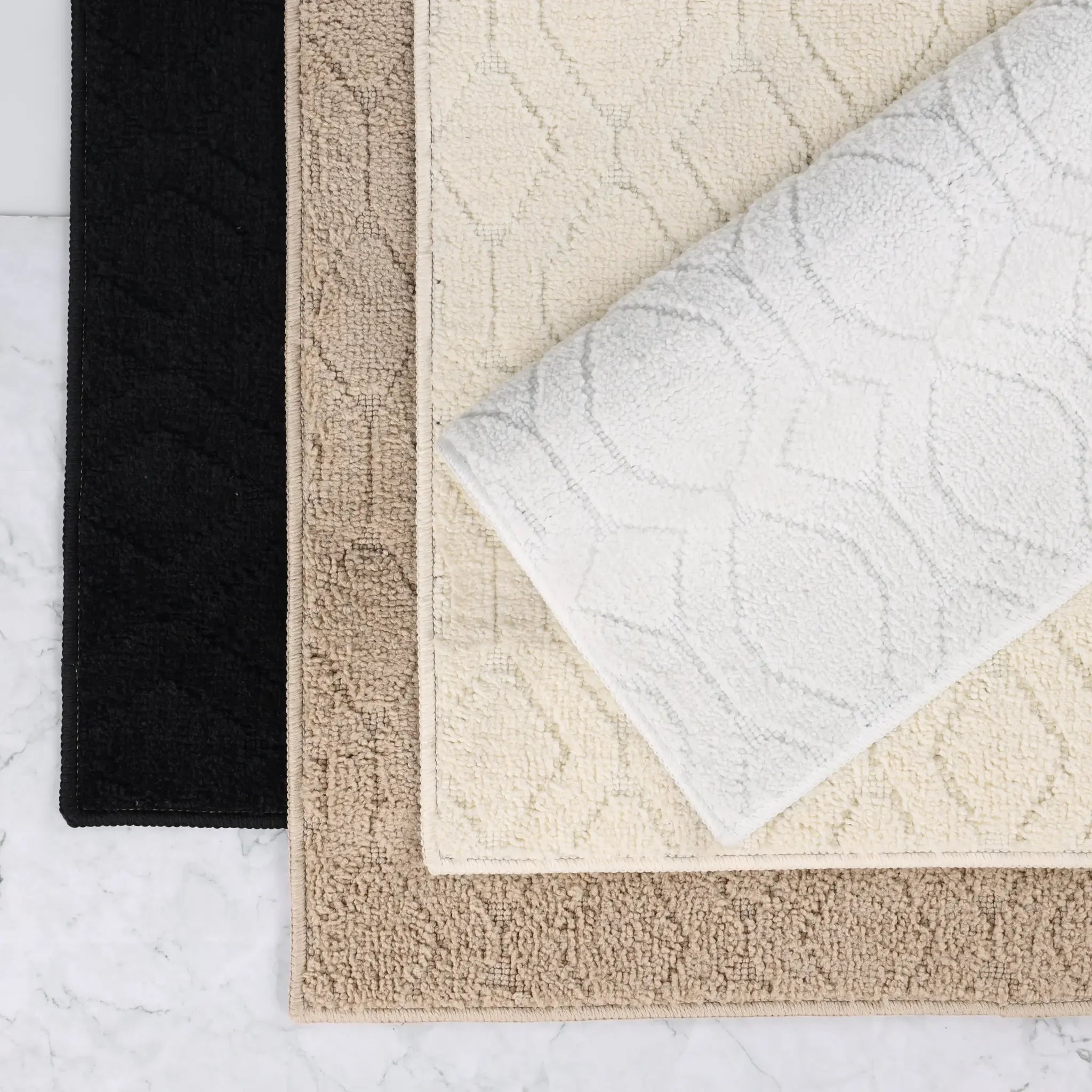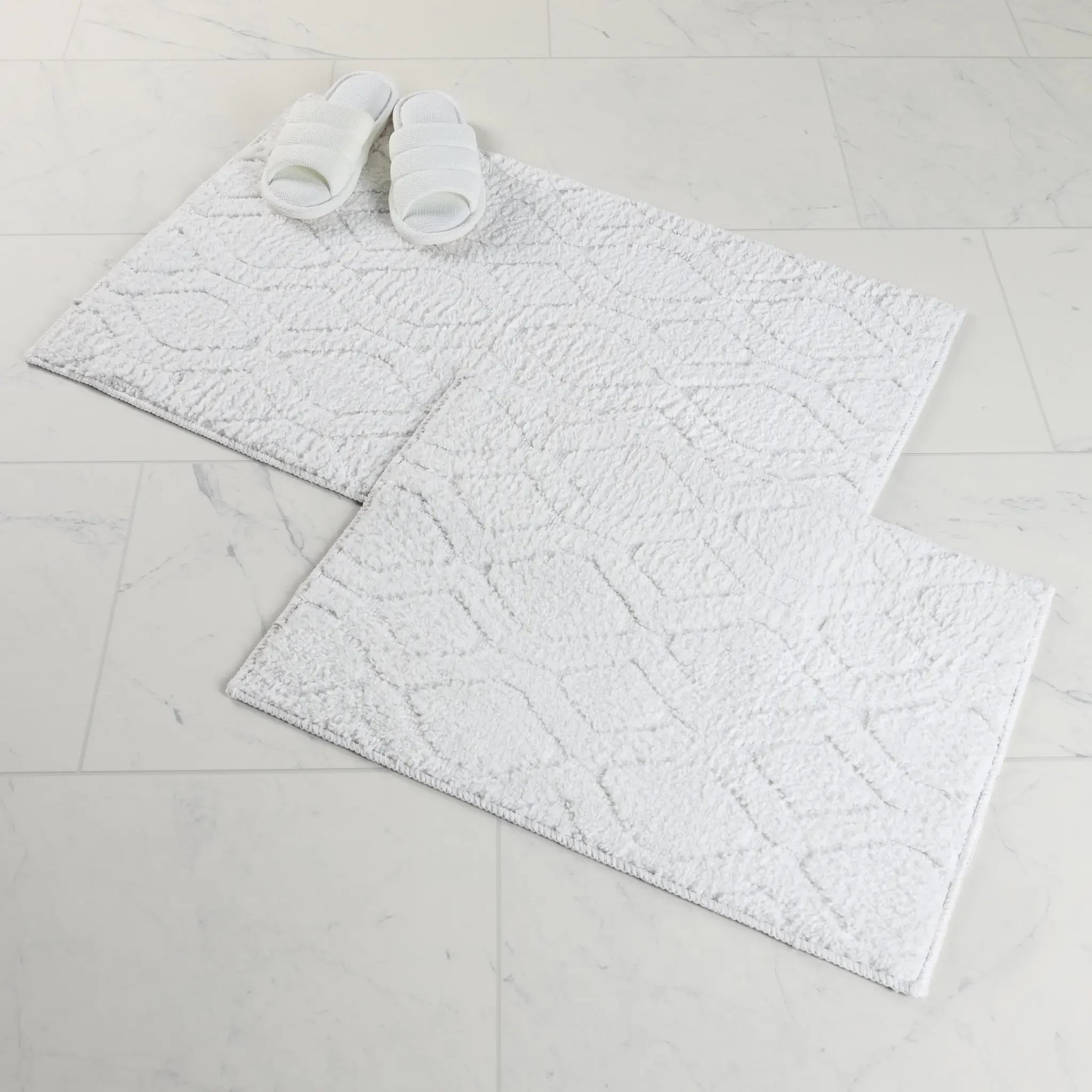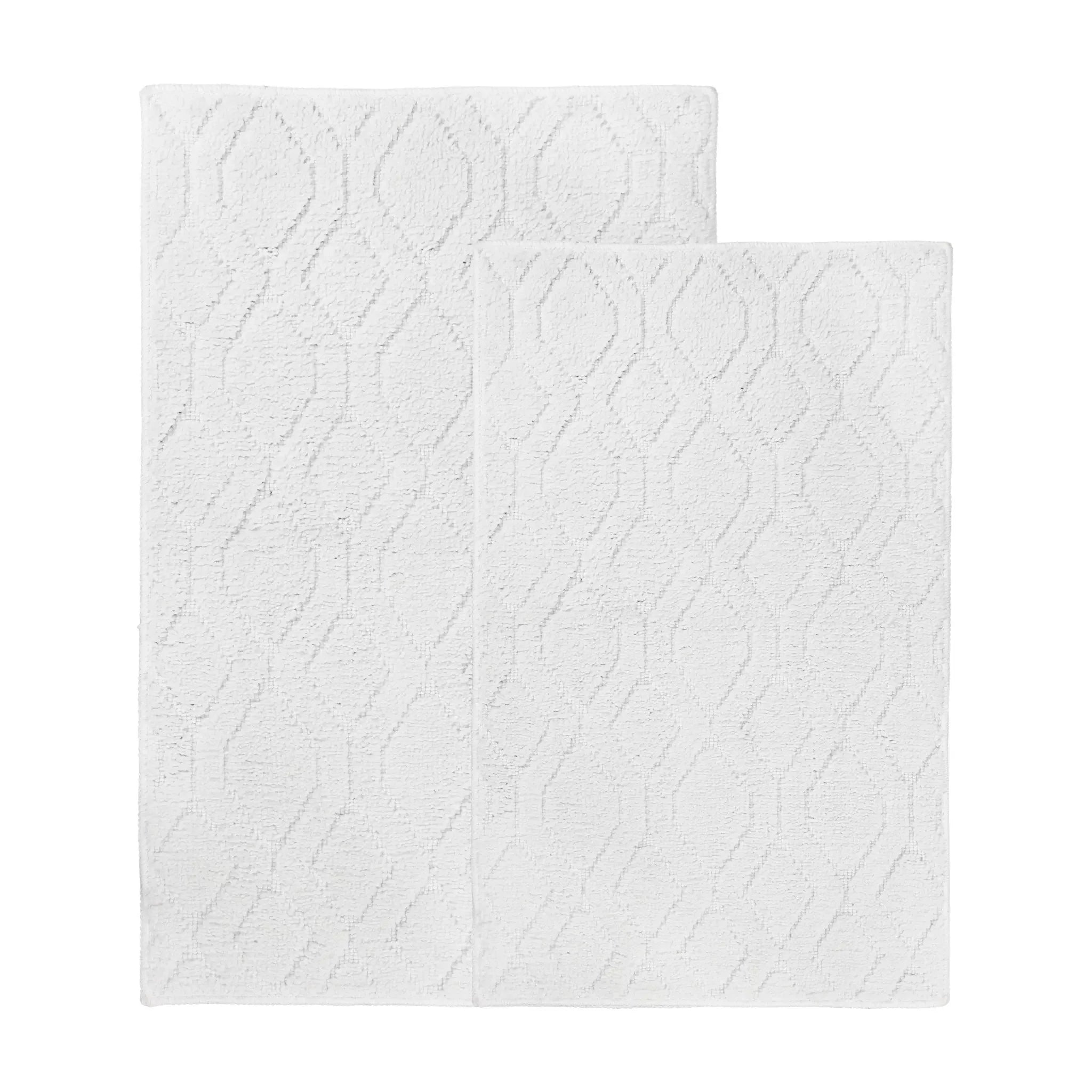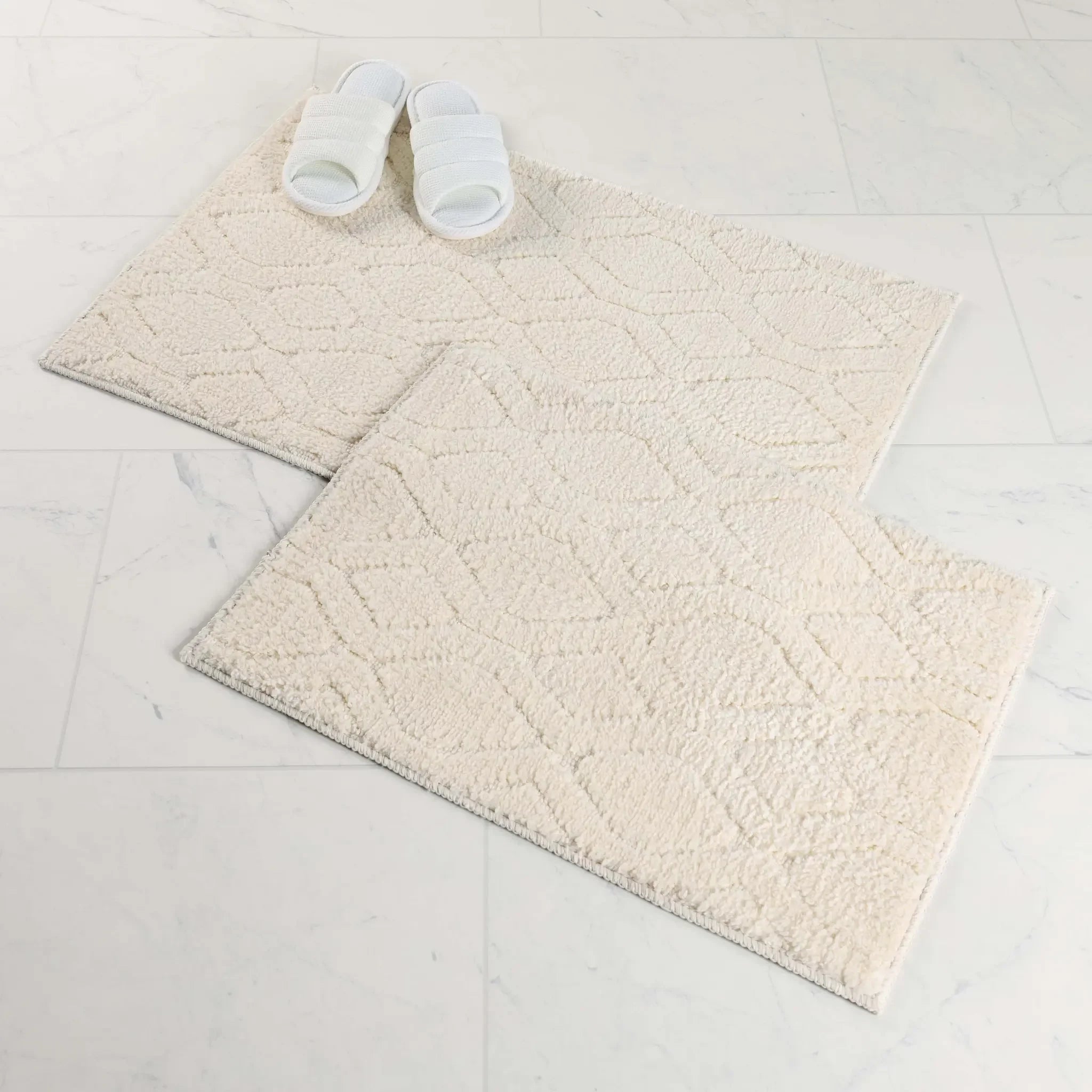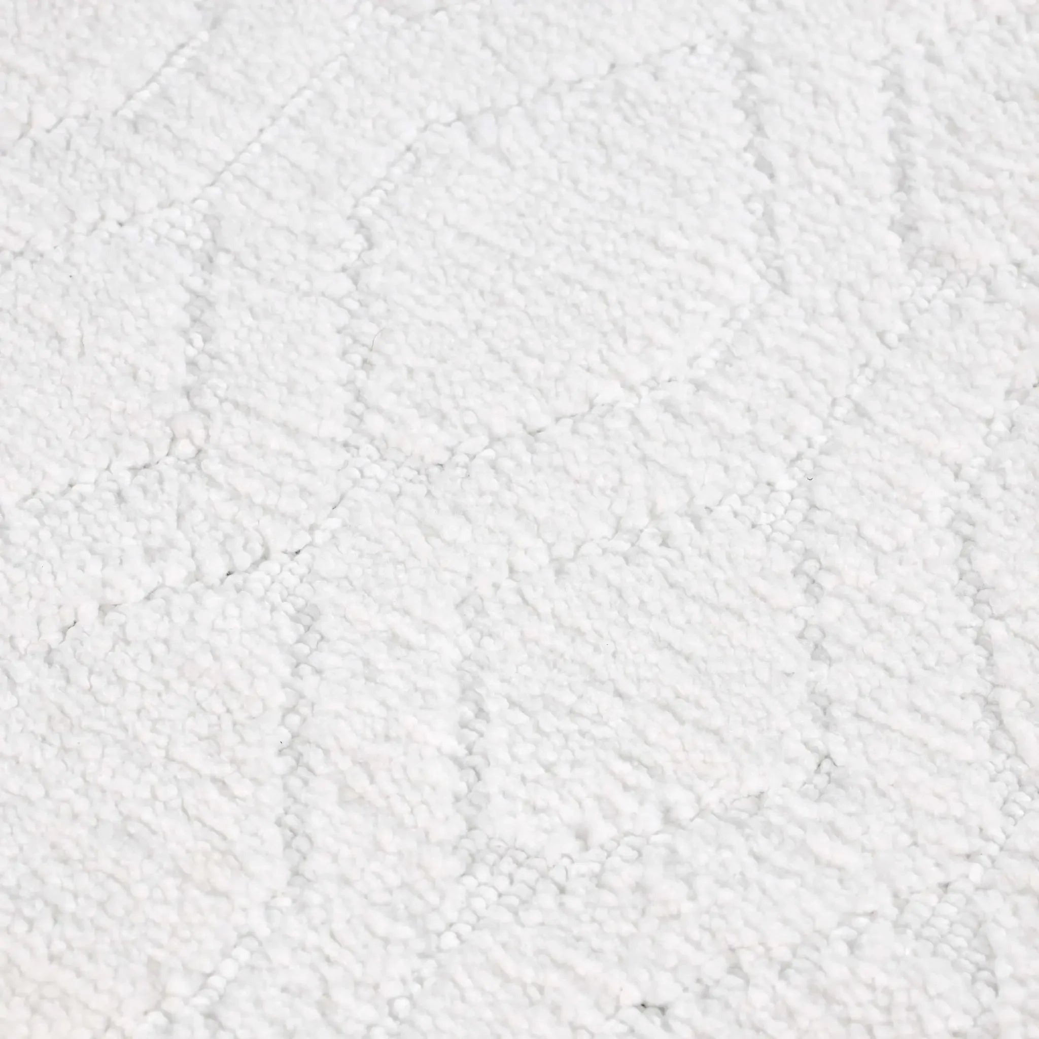 Infuse your bathroom with modern elegance with our Brou Diamond Lattice Bath Rug Set. This set of two rugs boasts a chic geometric pattern and a luxurious high-low pile that adds depth and texture to your space. Available in a range of sophisticated colors – White, Ivory, Beige, and Black – these rugs effortlessly complement any decor.