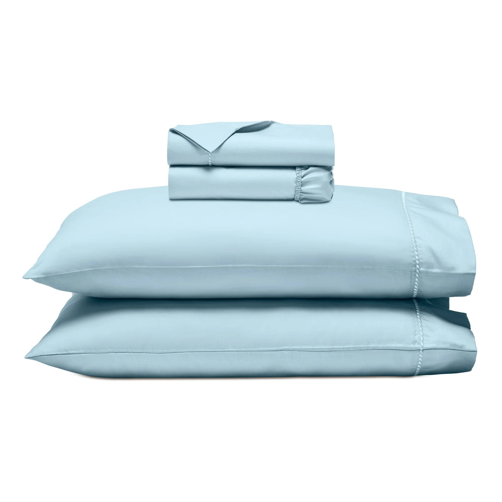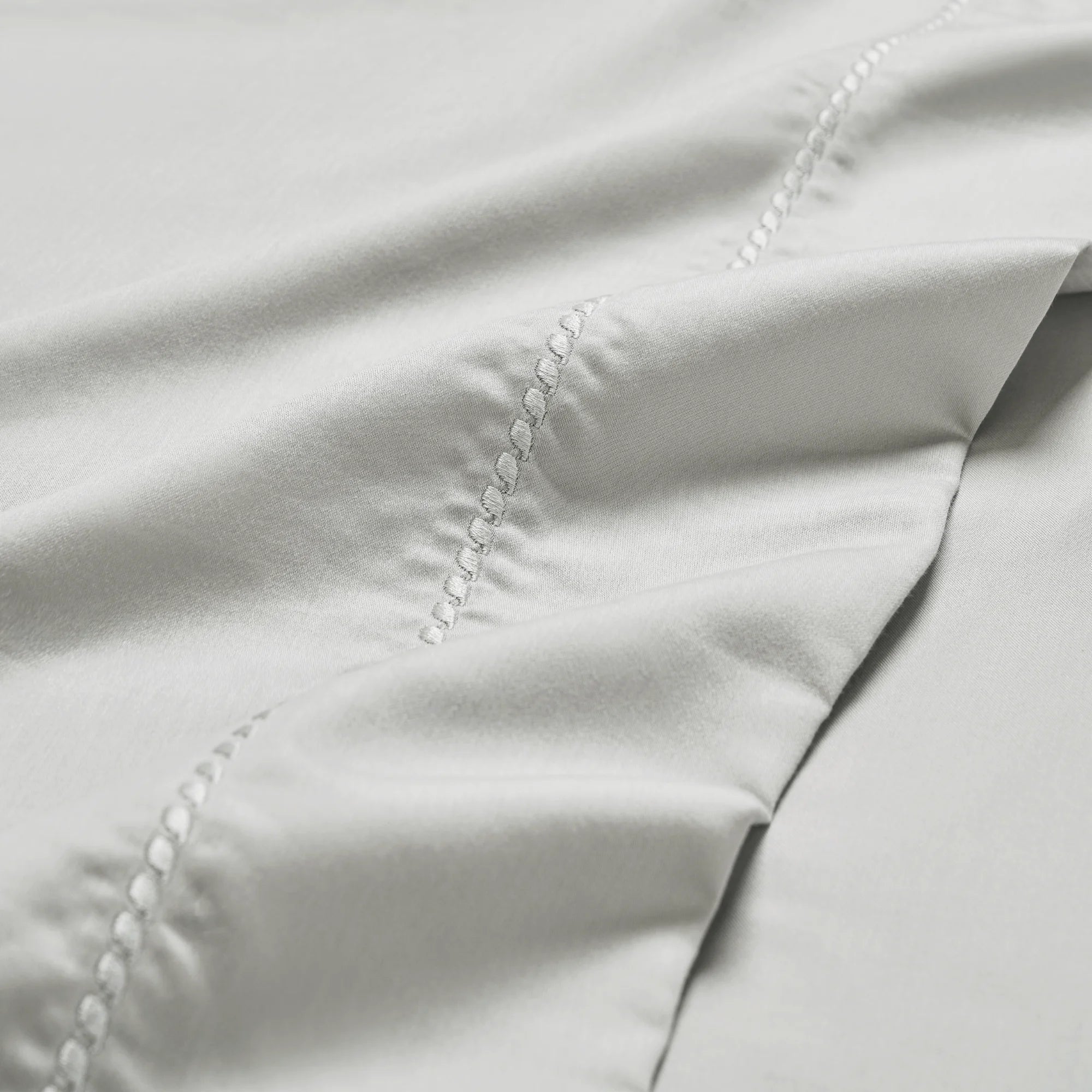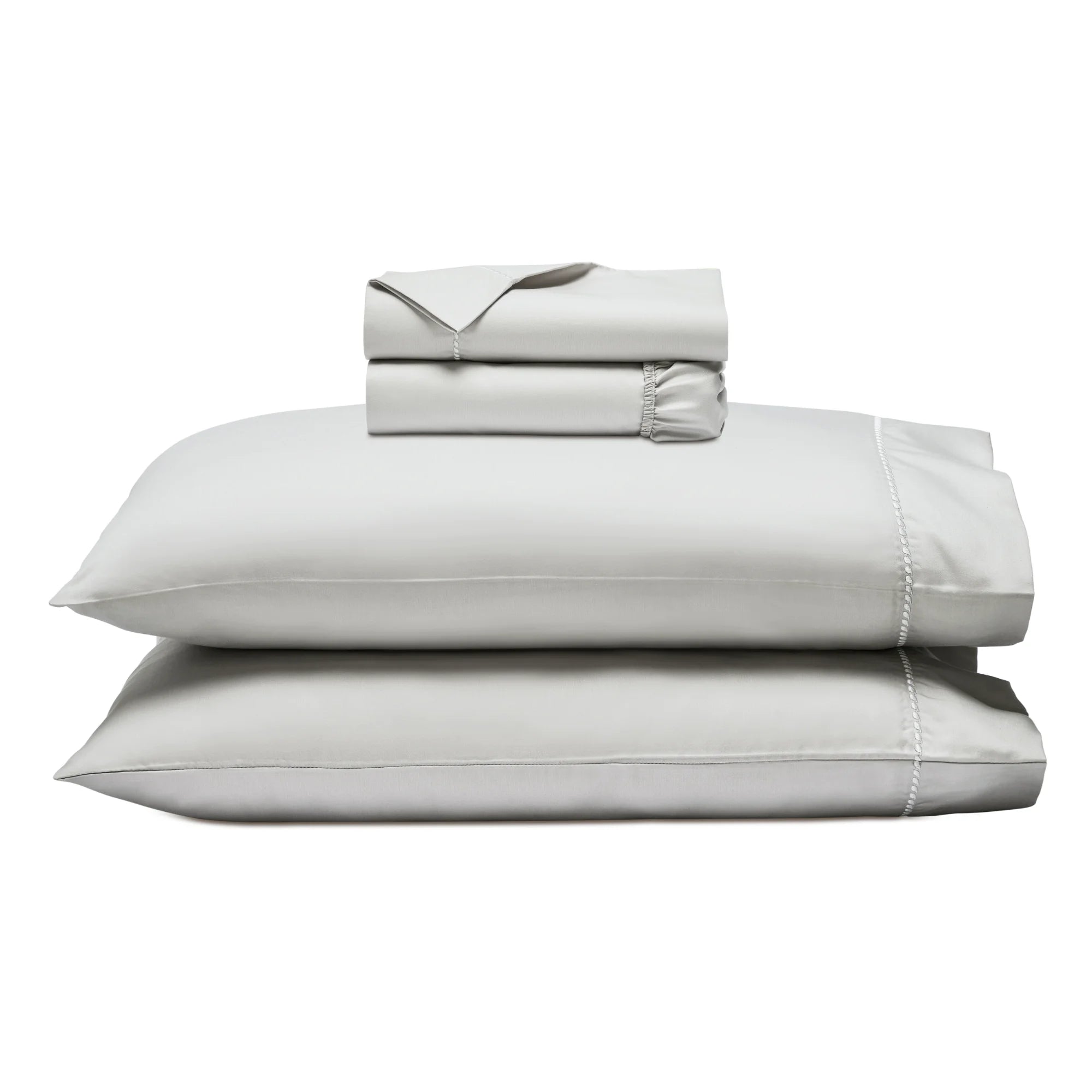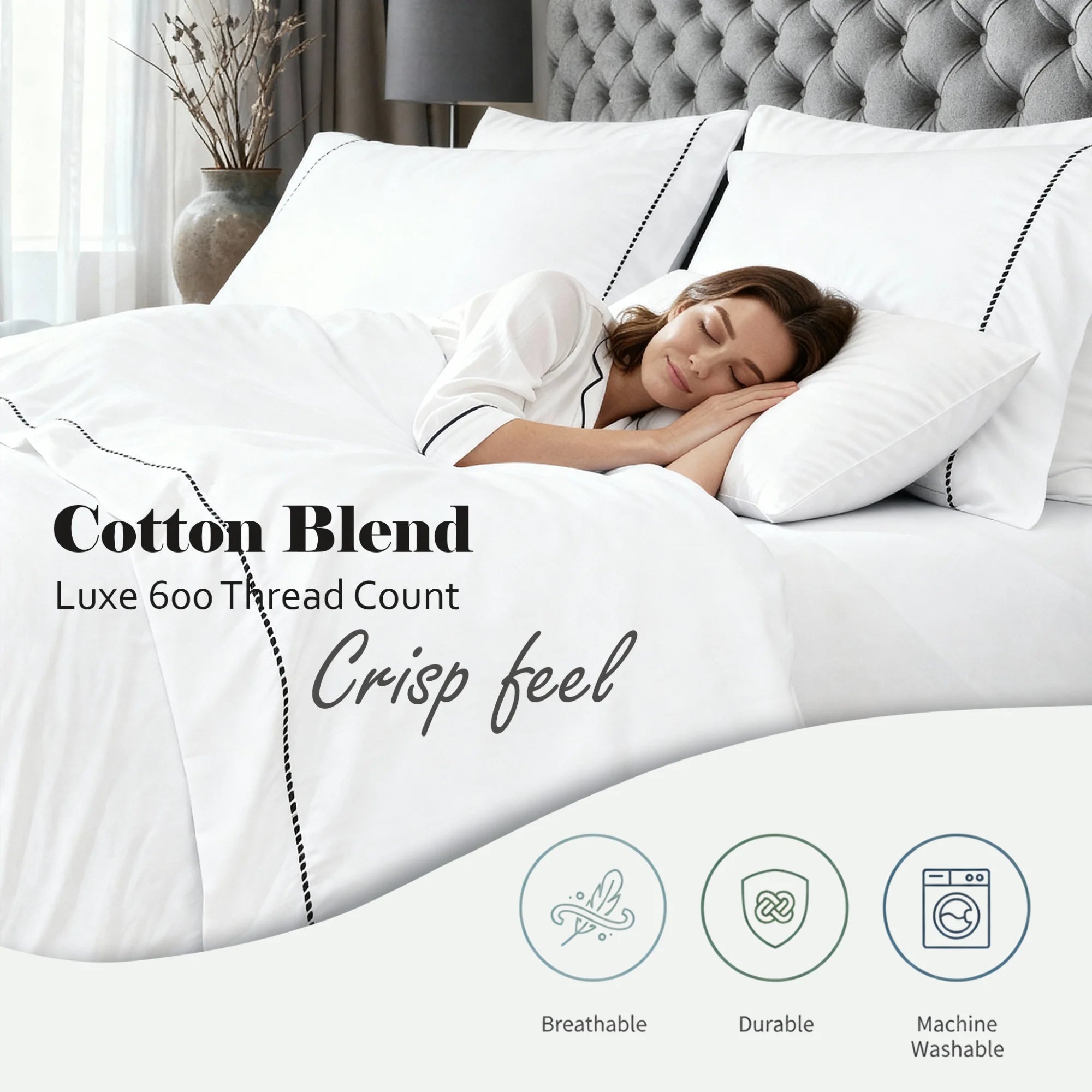 Experience the structured crispness of the Imperia Cotton Blend 600 Thread Count Sheet Set. Crafted with a sateen weave for a luxurious feel, these sheets deliver a fresh, high-end hotel hand-feel. The design features a refined dash stitch embroidered hem and pillowcases with a polished 4-inch hem for tailored elegance.