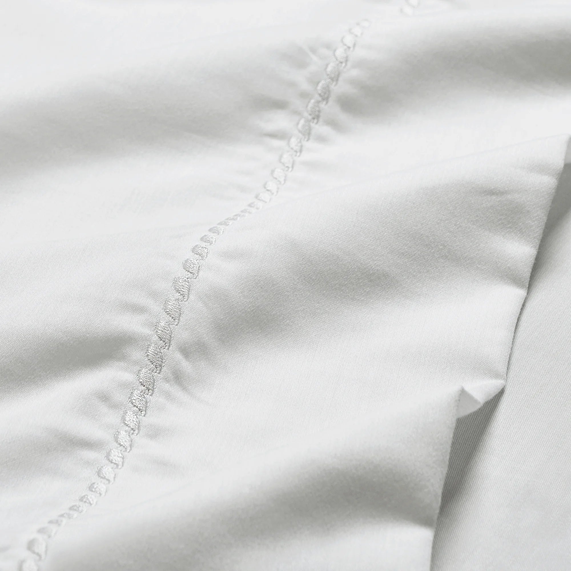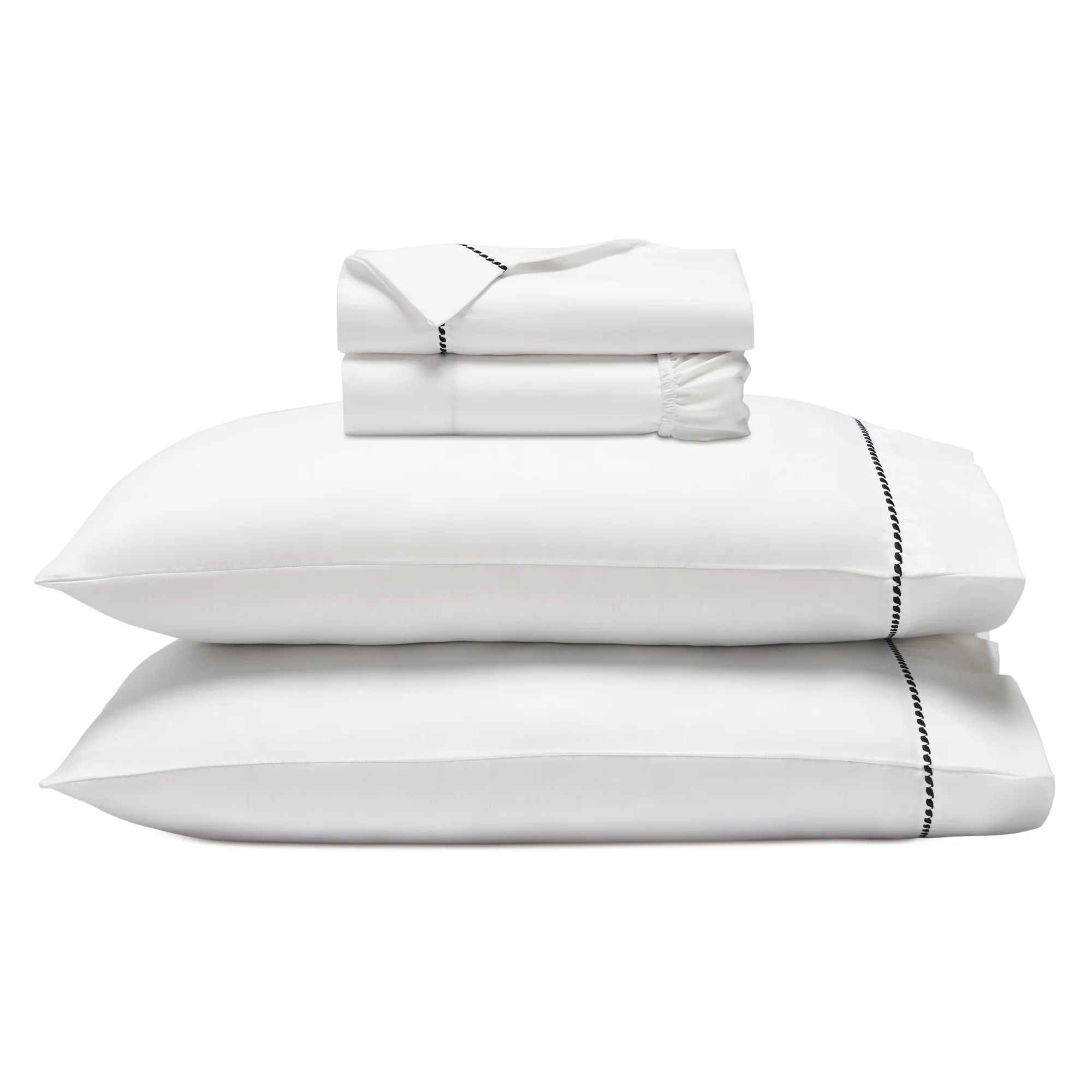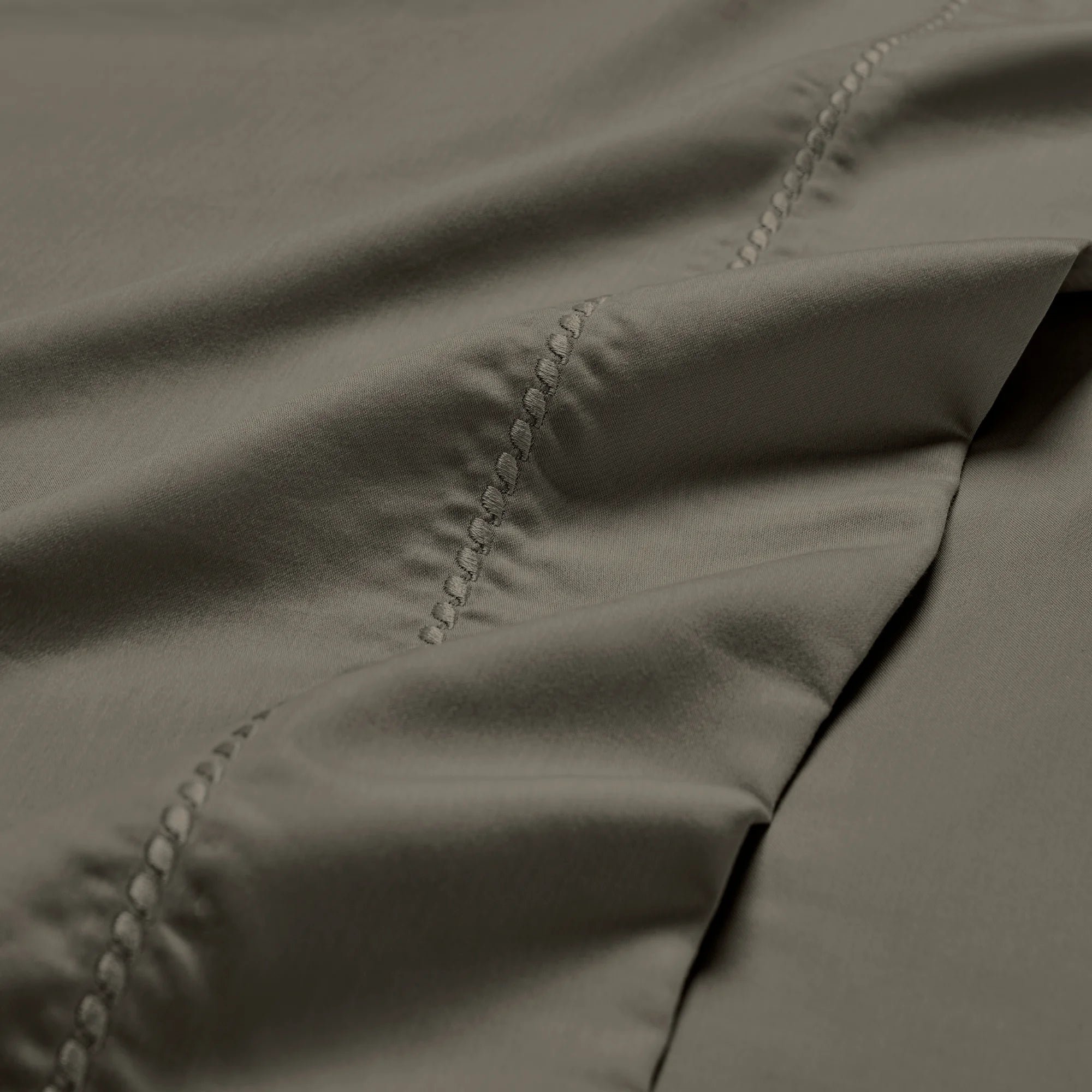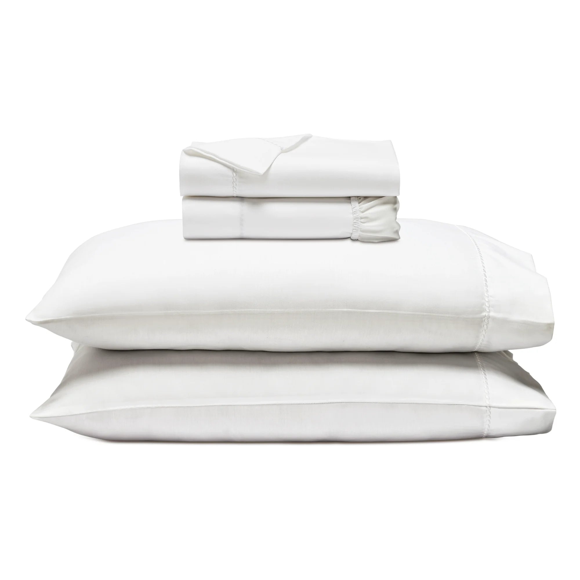 Experience the structured crispness of the Imperia Cotton Blend 600 Thread Count Sheet Set. Crafted with a sateen weave for a luxurious feel, these sheets deliver a fresh, high-end hotel hand-feel. The design features a refined dash stitch embroidered hem and pillowcases with a polished 4-inch hem for tailored elegance.