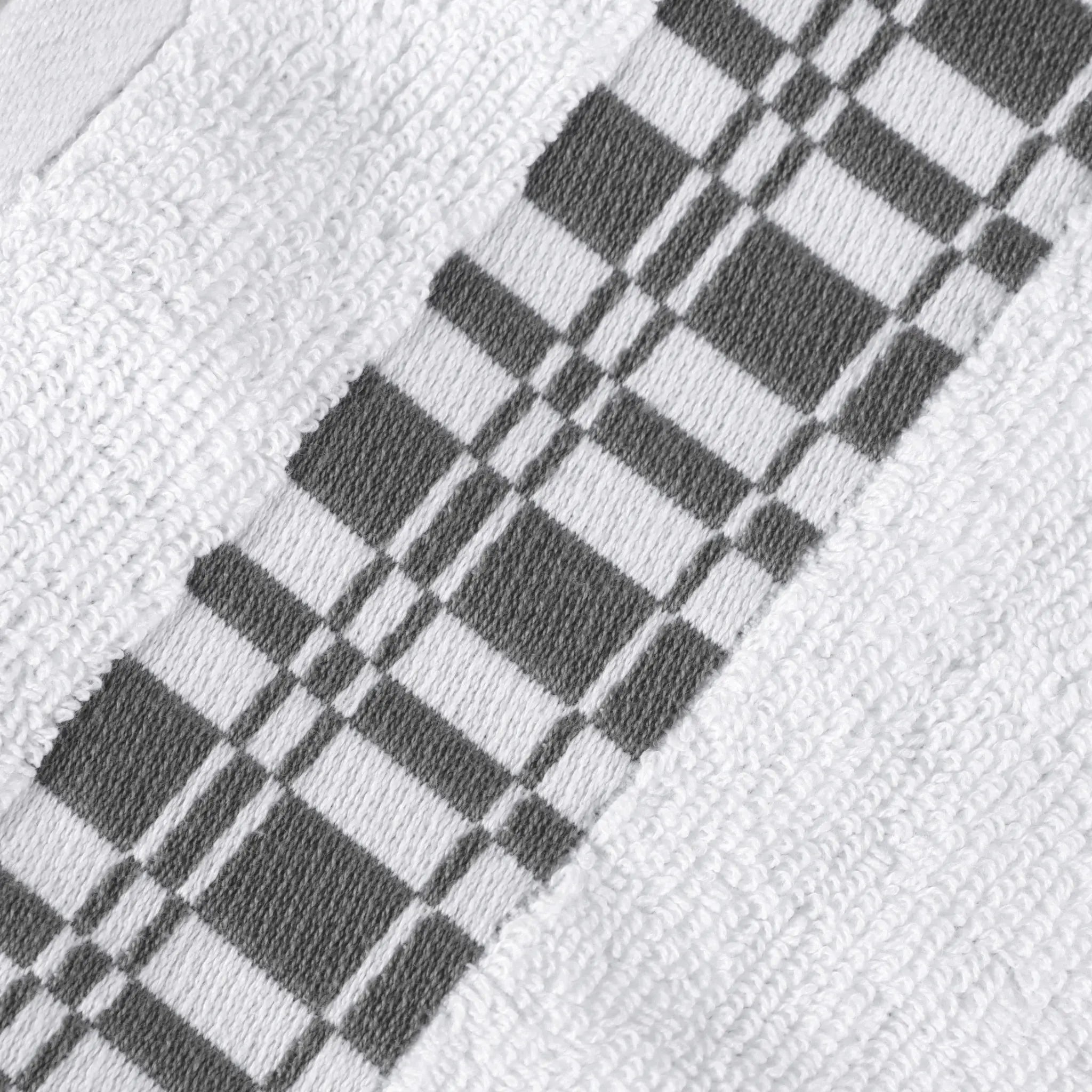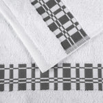 • Design Details: Each solid towel displays a decorative geometric dobby border.